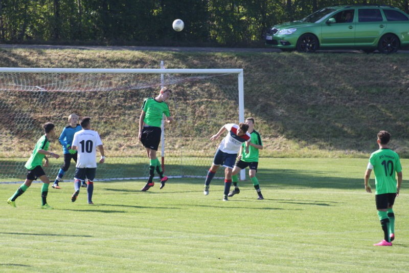 Anpfiff. Neutraubling stößt an. JFG macht gleich Druck. Nach 9 Minuten gibt es auf beiden Seiten noch keinen Abschluss zu verbuchen. Oh erste gute Chance! Der Torwart der Neutraublinger machte einen Ausflug nach draußen kommt aber nicht als erstes an den Ball; Abschluss aber zu schwach, der Verteidiger kann klären. JFG mit Ballverlust im Mittelfeld, dann geht’s schnell bei Neutraubling, Abschluss allerdings zu spät, Verteidiger grätscht den Ball ab. Sehr gut kombiniert Neutraubling, dann wird der Stürmer gestreckt – Freistoß aus 12 Meter. Und Pfosten! SG Neutraubling Großchance. Guter Freistoß, flach ausgeführt ins Torwarteck Pfosten. Elfmeter Neutraubling. Vom Schützen aus cool links unten eingeschoben – Torwart ohne Chance. Ja jetzt nimmt das Spiel Fahrt auf! Wieder sehr guter Schuss vom Gast! Torwart kann entschärfen. Doppelwechsel SG. Und da ist der Ausgleich! 1:1 durch Luki. 1. Gelbe Karte für Neutraubling Nummer 99 wegen Ballsperre. Super Abschluss JFG wird aber nicht belohnt. Neutraubling wieder mit einer guten Aktion, Torwart klärt zur Ecke, die nichts einbringt. Erneuter Wechsel von Neutraubling. Gelbe Karte JFG wegen meckern, da klingelt es in der Mannschaftskasse… wenn der Schiri pfeift dann muss man das so hinnehmen. Und jetzt 5 Minuten Zeitstrafe für den Spieler, wenn ich es richtig gehört habe wieder gemeckert. Da wird der erste Zuschauer vom Platz verwiesen!! „Pfeif halt gscheid du Volldepp“ das lässt sich der Schiri nicht zweimal sagen. Wieder Foulspiel JFG. Freistoß geht rechts am Tor vorbei. Donautal wieder komplett! Jetzt sollte er es aber wissen, dass er leise sein soll der Kapitän. Halbzeit.